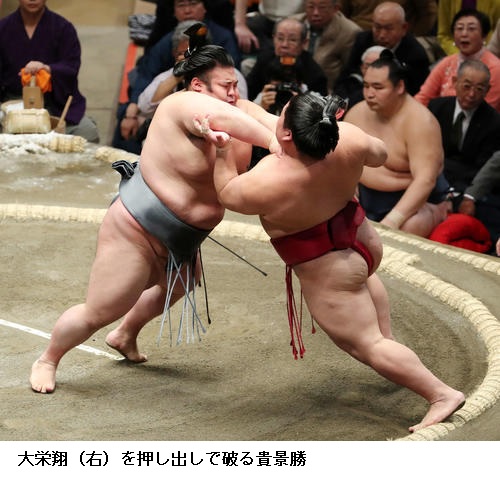 ▽正代に大栄翔は正代が押し出しで勝って1敗を守りました。新小結の大栄翔は負け越しです。