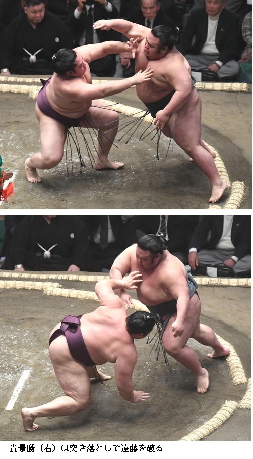 貴景勝は「集中していけたとは思うがもう少し実力を上げていかないと厳しいものがある。朝から準備してきたし甘えがあったとはいえない。結果論だけどどれだけ悔しくても戻ってはこない。頑張って強くなるしかない」と話しました。 (NHK WEB NEWS 2020年1月20日 19時29分)