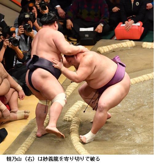 新関脇 朝乃山は小結以上でただ1人3連勝、「自分の形になって寄り切れた。いいんじゃないですか。体がしっかり動いている。よけいなことを考えず1日、一番、自分の相撲を取り切るだけだ」と淡々と話していました。