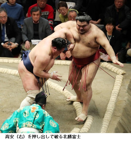 ▽北勝富士に大関 貴景勝は北勝富士が押し出し。
