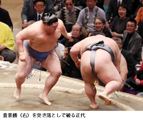 大相撲初場所9日目 平幕の正代が1敗守る ―― 大相撲初場所は9日目。平幕の正代が大関 貴景勝に突き落としで勝って、1敗を守りました。