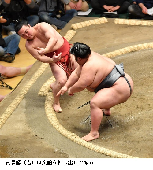 ▽炎鵬に大関 豪栄道は炎鵬が押し出しで勝ちました。炎鵬は初めての大関戦で勝ち星を挙げ、5勝目。白星先行です。