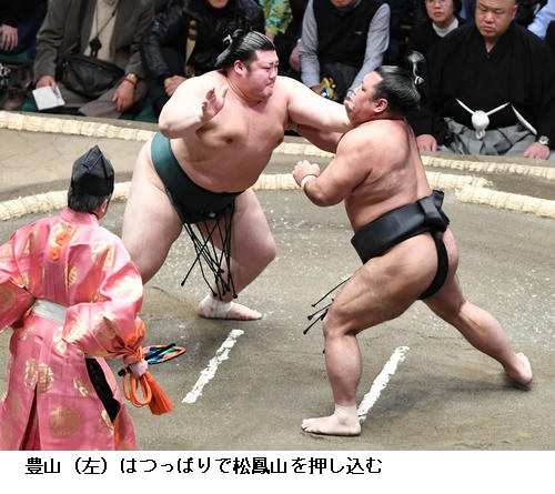 ▽松鳳山に豊山は豊山が押し倒しで勝って9勝2敗としました。