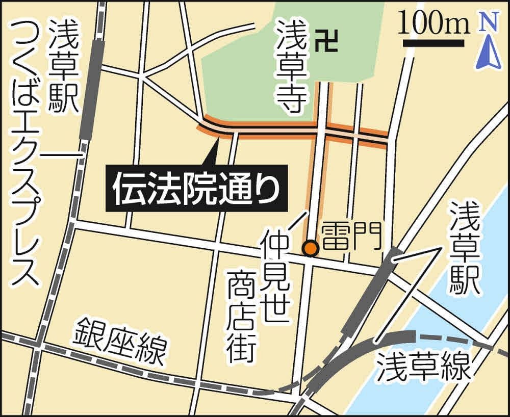 伝法院通りは、浅草寺の仲見世商店街と交差する形で東西に約300メートル伸び、両脇に土産物店などが並ぶ。2000年代に入ってからのリニューアル事業で江戸の町並みが再現された。メンチカツや大学芋の人気店も進出し、着物姿で食べ歩きする客も多い。人力車の定番コースにもなっている東京を代表する観光スポットだ。