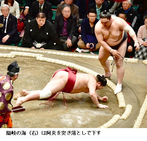 ▽阿炎に隠岐の海は隠岐の海が突き落とし。