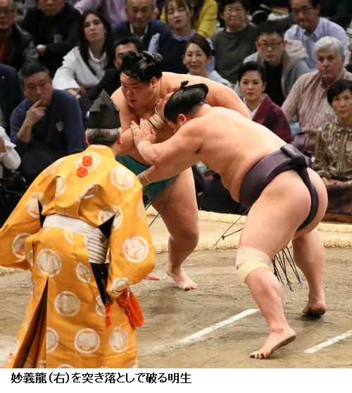 ▽妙義龍に明生は、明生が突き落としで勝ちました。