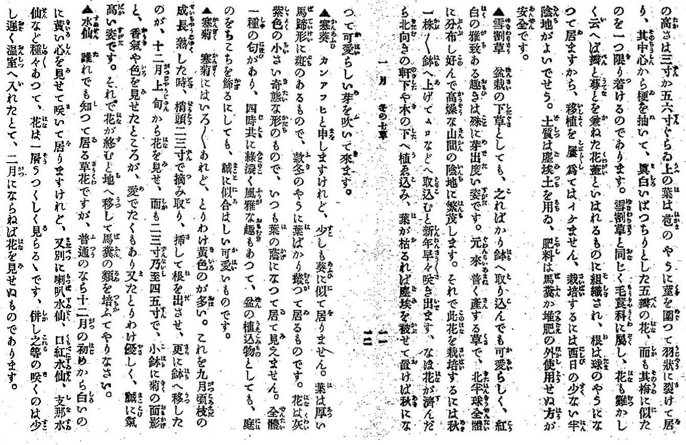 冬の七草は、春の七草や秋の七草ような古事に基づくものは見られませんが、明治41年(1908年)に久田二葉が書いた「園芸十二ケ月」に、『植物学者伊藤篤太郎博士が、先年冬の七草を選定した』とするものがあります。
