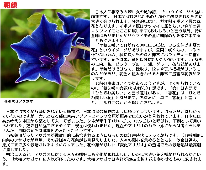 ・古代の中国では朝顔は高価な薬で、牛と取引されたほどのものだったので漢名の「牽牛(けんぎゅう)」はそれにちなむものです。(牽牛子と呼ばれていた)