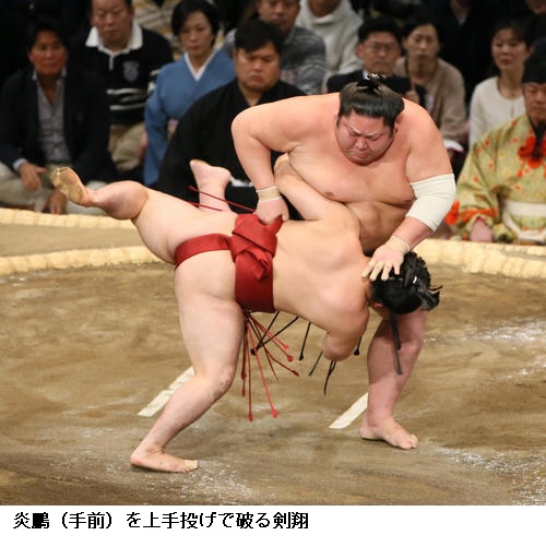 ▽剣翔に炎鵬は、剣翔が上手投げで勝ちました。
