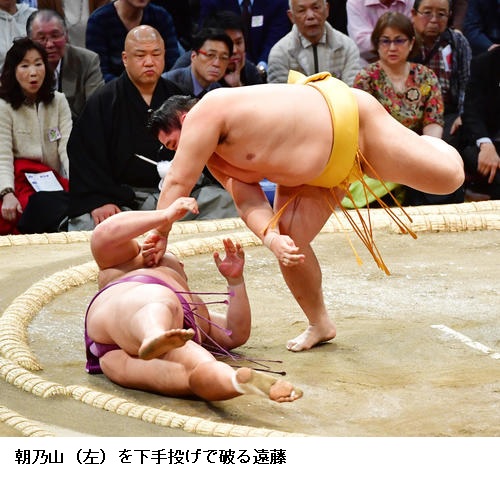 ▽遠藤に朝乃山は遠藤が下手投げ。朝乃山は2敗目を喫しました。
