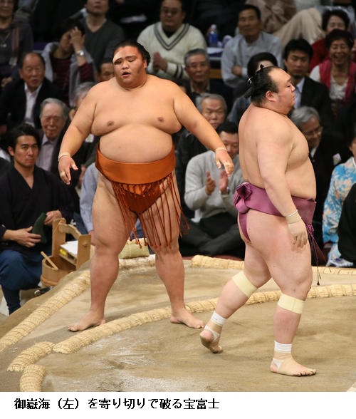 ▽宝富士に横綱・白鵬は、白鵬がはたき込みでただ1人の1敗を守りました。