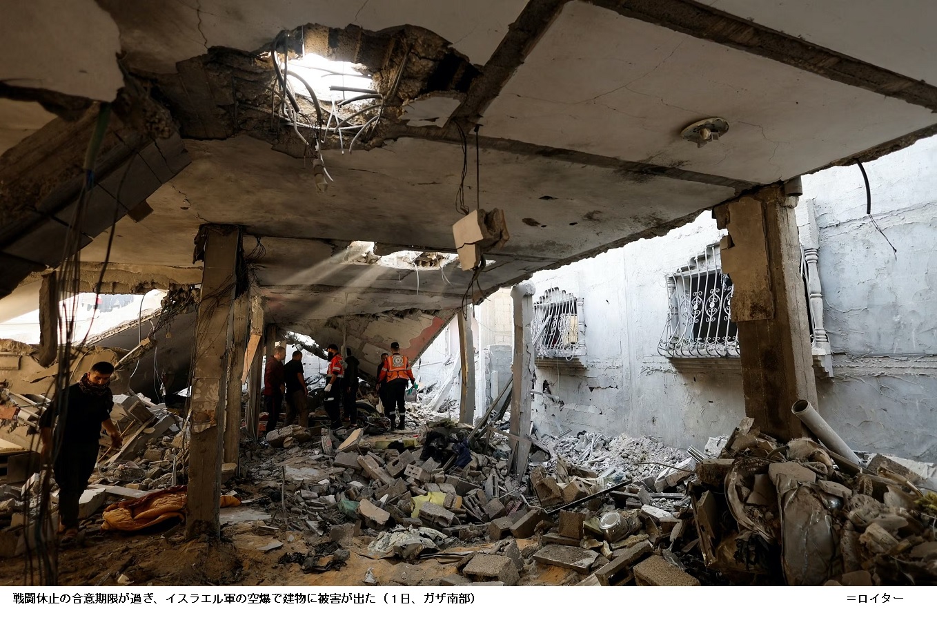 イスラエル軍、ガザへの攻撃再開 「ハマスが合意違反」 ―― イスラエルとイスラム組織ハマスによる戦闘休止の合意期限が1日午前7時(日本時間午後2時)に切れた。イスラエル軍は同日、ハマス側の合意違反を理由にパレスチナ自治区ガザへの攻撃を再開したと明らかにした。11月24日に始まった戦闘休止は7日間で終わった。