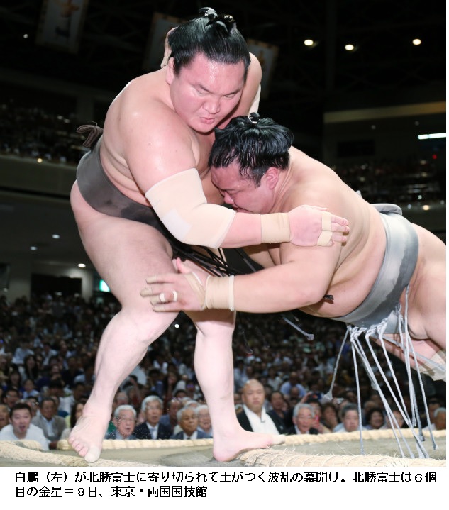 △北勝富士に横綱 白鵬は、北勝富士が寄り切りで勝ちました。場所前に日本国籍を取得した白鵬は初日に黒星を喫しました。