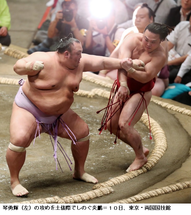 炎鵬は土俵際で粘りを見せて3連勝、「まっすぐいこうと思った。相手の突きが目に入り見えなくなったが感覚でいった。そこから『残った』という声が聞こえるまで記憶がない。気が付いたら残っていてそこからがむしゃらにいった。土俵をうまく使えている。勝負どころをつかめているのが勝ちにつながっている」と振り返りました。