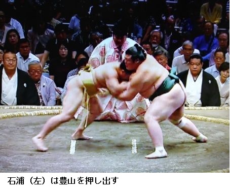 ▽石浦に豊山は石浦が押し出しで勝って2日目から6連勝です。