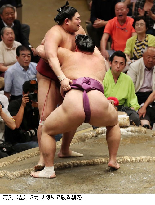 ▽阿炎に朝乃山は、朝乃山が寄り切りで7勝目。