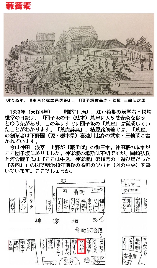 下谷團子坂の出店なり。夏は屋根の上に柱を建て、席を敷きて客を招ず。時々夕立に蕎麥を攫はる、とおまけを謂はねば不思議にならず。