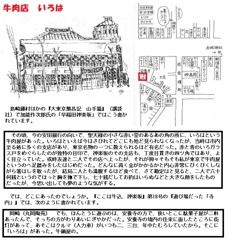 いろは(※という名前の牛肉店)のことである。単に外から見れば大きく立派な建物なのだが、奥行きは少しもなく中は三角形でこぢんまりとしている。思うに幾何学的の不思議なのだろう。