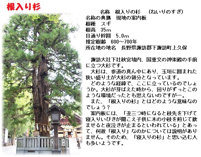 秋宮境内の大杉。丑三つ時になると、枝を垂らして鼾を掻いて寝たという。