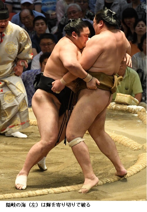 △輝に隠岐の海は隠岐の海が寄り切りで勝って勝ち越し。輝は負け越しです。