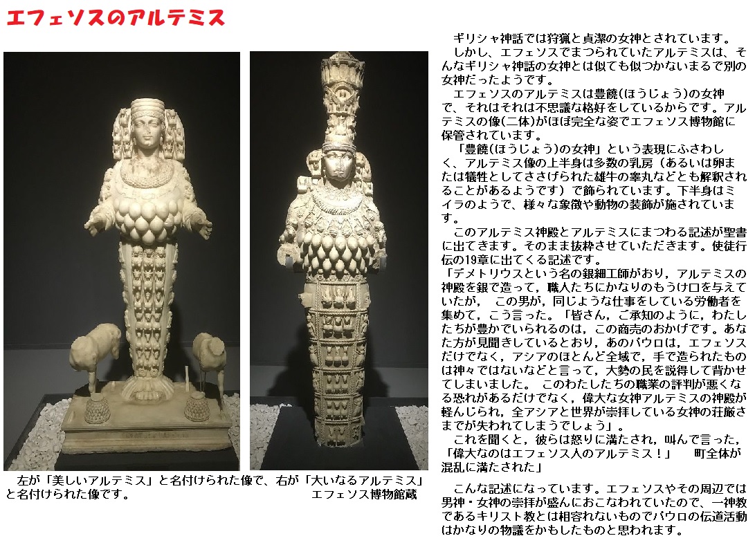 一方、エフェソスでは、アルテミスは非常に敬われていました。例えば、月の1つはアルテミスの名前を冠しており、その月には丸1ヶ月祝祭が催されました。信仰の対象はギリシア文化以前の古い偶像でした。その元となる偶像は木製で、ギリシアのアルテミスに見られる処女性とは対照的に、豊穣多産を象徴する多数の乳房を持っていました。そして、この女神の象徴は蜂でした。