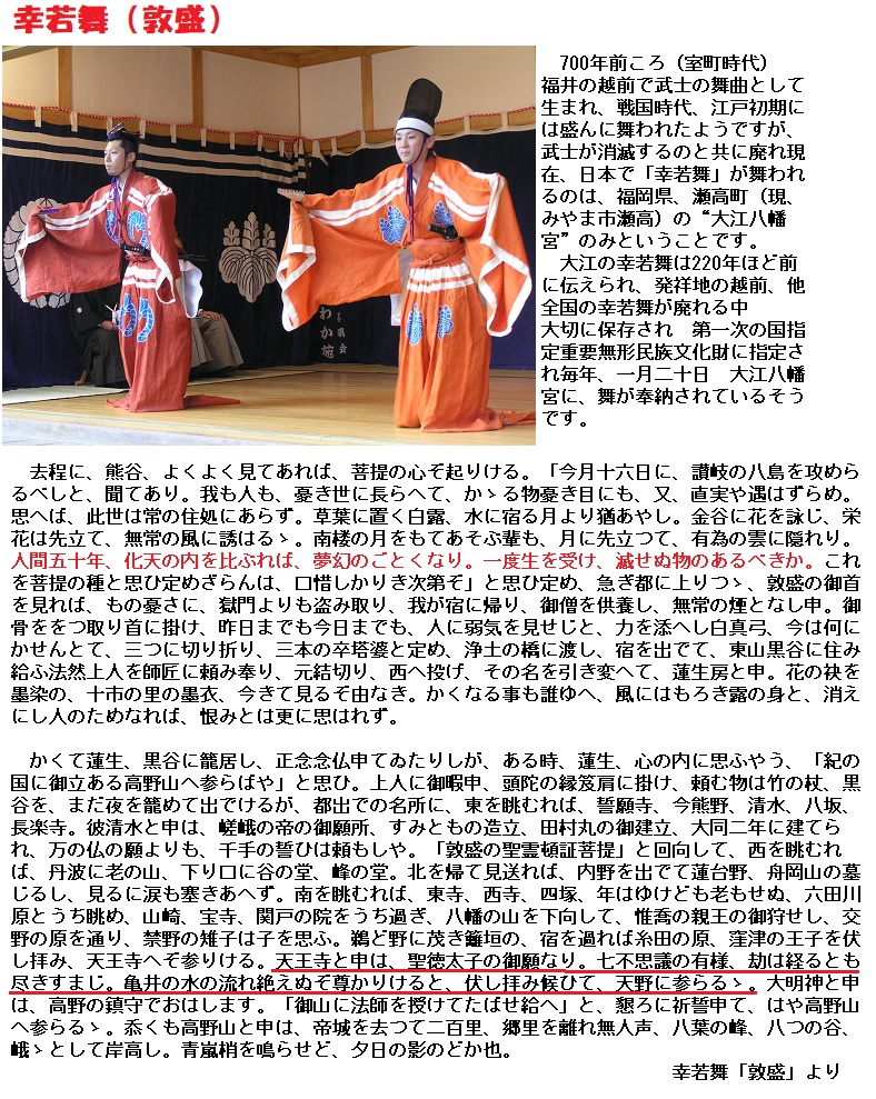 幸若舞(こうわかまい)の「敦盛(あつもり)」に天王寺の七不思議ということばが出てきますが、これは同寺の三水(さんすい)・四石(しせき)の七不思議についてのことです。三水とは「荒陵池水、亀井(かめい)、閼伽井(あかい)」をいい、四石とは「転法輪石、影向石(ようごうせき)、礼拝石、引導石」のことです。天王寺は聖徳太子の創建と伝えられているので、あるいは太子の奇跡にかかわったものでしょうか。
