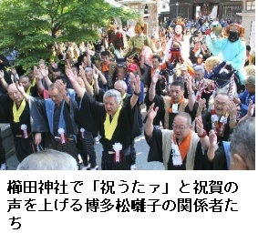 福博包む祝うたァ 博多松囃子が櫛田を参拝 稚児西流が伝統の舞披露 ―― 「祝(いお)うたァ」-。福博の街に威勢のいい祝賀の声がこだました。「博多どんたく港まつり」が開幕した3日の朝、祭りの起源である「博多松囃子(まつばやし)」の一行は、まず福岡市博多区上川端町の櫛田神社を参拝した後、市内に繰り出し、日ごろ世話になった商家や企業、個人宅などを回った。