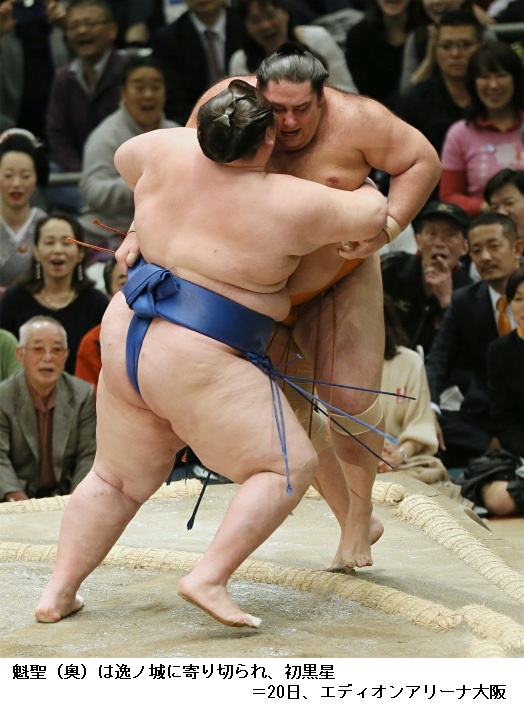 9連勝の魁聖に逸ノ城は、逸ノ城が寄り切りで勝ちました。互いに200キロを超える大型力士どうしの一番は、がっぷり四つで1分を超える熱戦となり、最後は逸ノ城が寄り切って魁聖の連勝を止めました。逸ノ城は8勝2敗と勝ち越しました。魁聖は9勝1敗です。