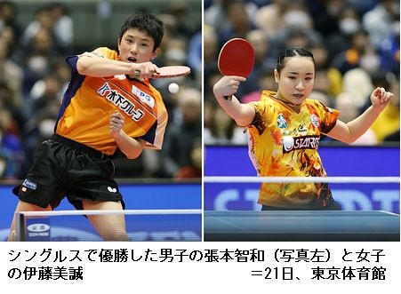 14歳張本、最年少優勝=女子は17歳伊藤が3冠-全日本卓球 ―― 卓球日本一の座を争う全日本選手権は21日、東京体育館で最終日の男女シングルス決勝が行われ、男子は中学2年で14歳の張本智和(エリートアカデミー)、女子は17歳の伊藤美誠(スターツ)がともに初優勝を果たした。張本は男女を通じて史上最年少優勝。女子ダブルス、混合ダブルスも制した伊藤は、女子で史上最年少となる3冠に輝いた。