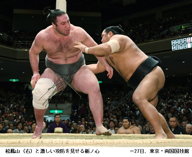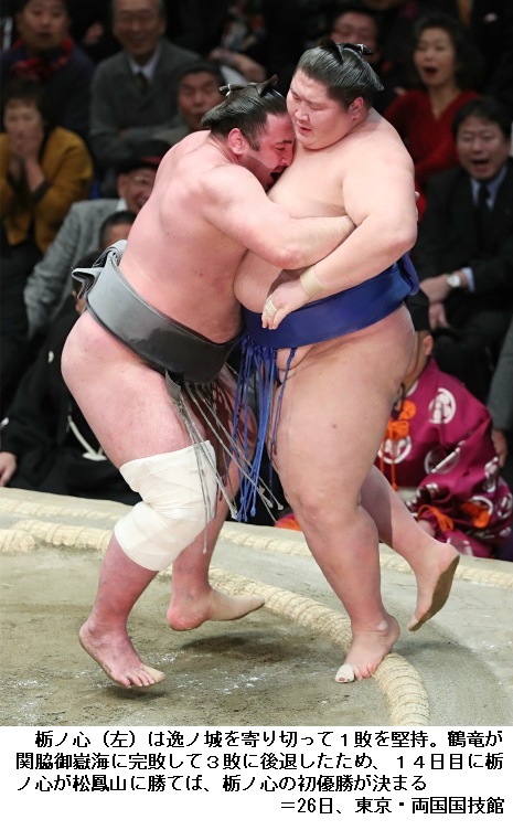大相撲初場所千秋楽 初優勝の栃ノ心は14勝1敗 ―― 大相撲初場所は千秋楽の取組が東京・両国の国技館で行われ、27日、初めての優勝を決めた平幕の栃ノ心が遠藤に勝って14勝1敗として今場所を終えました。中入り後の勝敗です。