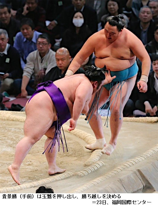 隠岐の海に貴景勝は、貴景勝が押し出し。貴景勝は11勝目です。