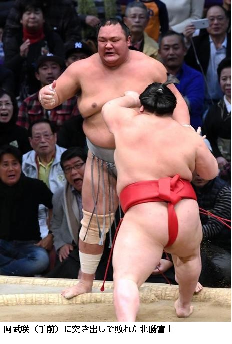 阿武咲に北勝富士は阿武咲が突き出し。北勝富士は3敗目です。