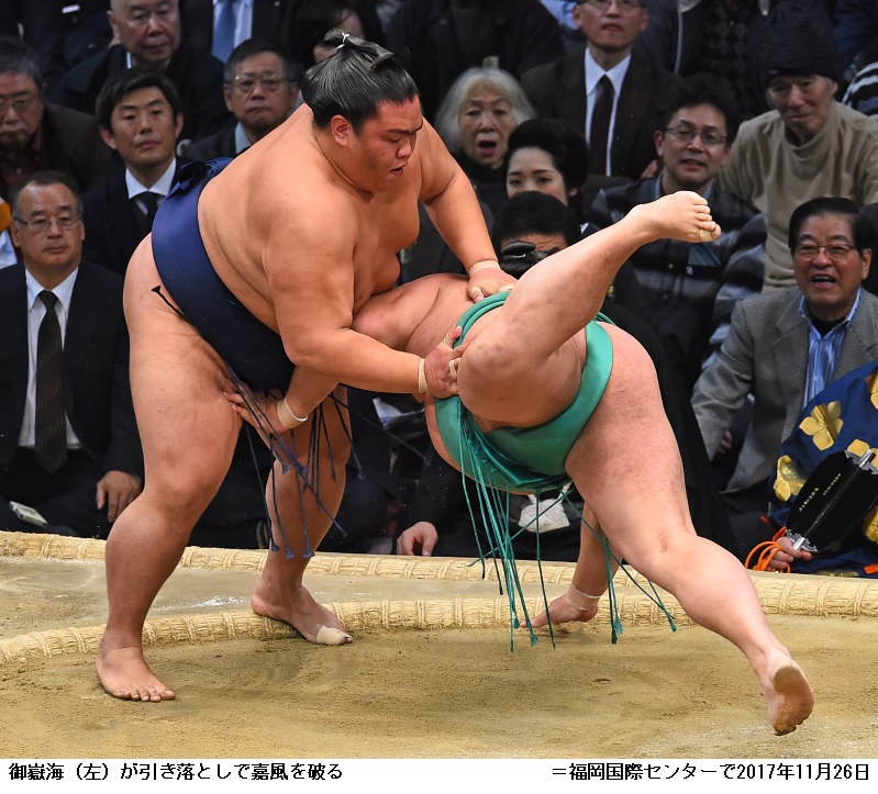御嶽海に嘉風は、御嶽海が引き落とし。