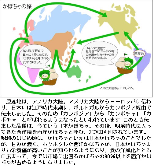 カボチャ類のもっとも古い記録はペポカボチャで、メキシコのTamaulipas(タマウリパス)の紀元前7000~前5500年の地層からは種子と果皮の一部が出土しています。ペポカボチャは考古学的資料からはメキシコとアメリカ西部に限定され、逆にクリカボチャはアンデスの高原地帯しか知られていませんでした。ニホンカボチャはペルーのHuaca Prieta(ワカ・プリエタ、ペルー北海岸チカマ河口の遺跡。紀元前2500年ごろから前500年ごろのもので、先土器時代から形成期中期の生活の跡をとどめる)の遺跡、ついでメキシコのTamaulipas(タマウリパス)の前1440~前440年の地層から発掘され、有史以前に南北アメリカに広がっていたことが知られています。新大陸の発見後、16世紀前半に世界に伝播(でんぱ)され、日本にもいくつかの経路で渡来したことが異名からわかります。九州の方言ボーブラはポルトガル語のabóbora(アボーボラ)に、ナンキン(南京)、トウナス(唐茄子)、カボチャ(カンボジア)はそれぞれ地名に由来するものです。
