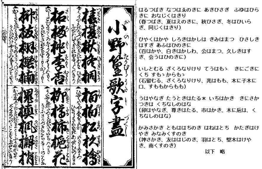同じ原理でできた漢字や字形の似通った漢字、また同字を含む熟語や世話字・宛字の類を行毎に二~五字(語)ずつ掲げ、さらに暗誦用の和歌を添えたのが『小野篁歌字尽』で、語彙科往来では最も流布したものの一つでした。