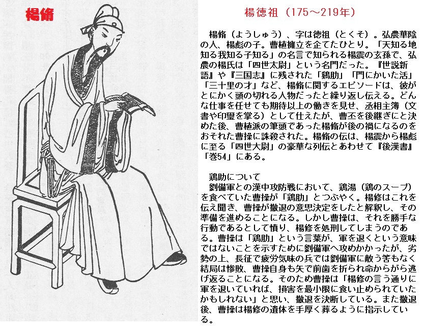 世説新語(捷悟篇第十一)の捷悟とは素早く悟るといういみで、この篇には機知にとんだ人々の挿話が集められています。楊脩と曹操の逸話について次のような記事があります。