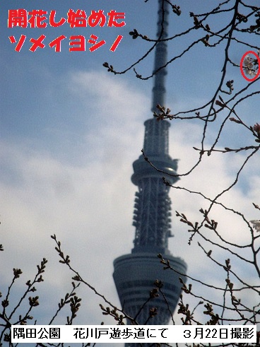 浅草寺病院から、浅草寺の境内を抜けて、婆様に頼まれた化粧品と歯磨きを買いに新仲見世のマツキヨを回り、隅田公園に出ました。浅草寺境内でも隅田公園でも、ソメイヨシノの木によっては2・3輪の花が咲き始めていました。