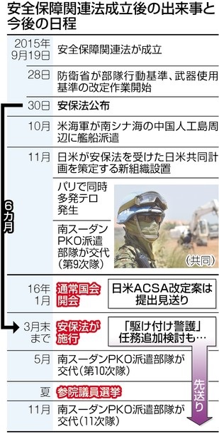 ■転換:他国を武力で守る集団的自衛権の行使や戦闘中の他国軍への支援を可能にする安保法のうち、政権が最初に適用しようとしているのは、南スーダンで自衛隊が道路整備などに従事している国連平和維持活動(PKO)での新任務だ。離れた場所で襲われた他国部隊や民間人を助ける「駆け付け警護」が解禁され、任務の遂行を目的とした武器使用の範囲が拡大されるため、五月の部隊交代時にも駆け付け警護を追加することを検討してきた。/だが、中谷元・防衛相は新任務の追加に必要な部隊行動基準の見直しや計画策定、訓練は「拙速を避け慎重に進める」と指示。防衛省幹部も「武器の使用など複雑な状況に直面する隊員に対し、十分な訓練をする必要がある」と指摘し、五月の任務追加を見送る姿勢に転じた。