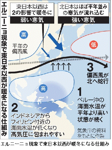 一般的にエルニーニョ現象が起きると異常気象になり、日本では冷夏暖冬になる傾向とされる。 仕組みは複雑だ。東の赤道付近で海水温が平年より高くなる反動で、①フィリピン付近では海水温が平年より低くなり、高気圧ができやすくなる。②偏西風が日本の東で北に蛇行し、北海道の東にある低気圧の影響が本州付近では弱く、冬型の気圧配置が長続きしない。③本州では、大陸の高気圧から冷たい北西風が吹きにくくなる。この結果、東日本以西の寒さが緩むと考えられている。北海道と東北地方では平年並みの寒さになる見通しだ。