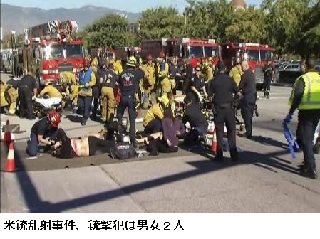 米銃乱射事件、銃撃犯は男女2人 ―― 【ロサンゼルス共同】米西部カリフォルニア州サンバーナディーノの福祉施設で2日起きた銃乱射事件で、警察は銃撃犯を男女2人と特定し、男は米国人のサイード・ファルーク容疑者(28)、女はタシュフィーン・マリク容疑者(27)=国籍不明=と発表。2人とも警察に射殺された。