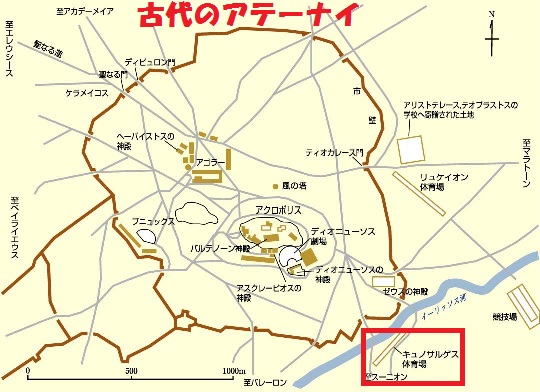 ※ Cynosarges(キュノサルゲス):アテーナイの城壁の外に隣接し、Ilios(イリッソス)川の南の丘にあった公共のgymnasion(ギュムナシオン、体育場)です。名称は cynos(キュノス) と argos(アルゴス) に由来し、「白い犬」または「すばしこい犬」を意味します。伝説によれば、Athēnai(アテナイ)のDidymos(ディディモス) がたくさんの生贄を捧げていたとき、白い(またはすばしこい)犬が現れて捧げ物を盗んで逃げた。ディディモスが驚いていると神託があり、その犬が捧げ物を落とした場所にヘーラクレースの神殿を建てよ、と告げたといいます。
