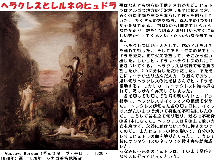 ヒュドラーは、Lerna(レルネー)の沼に住み、触れただけで全生命体を絶命させる宇宙最強の猛毒を有していました。ヘーラクレースはヒュドラーの吐く毒気にやられないように口と鼻を布で覆いながら戦わねばならなかったのです。