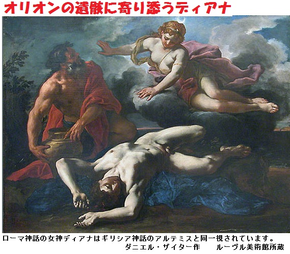 アルテミスは矢を放ち、オーリーオーンは矢に射られて死んでしまいます。アルテミス女神がオーリーオーンの死を知ったのは、翌日にオーリーオーンの遺骸が浜辺に打ち上げられてからでした。アルテミスは後に神となった医師Asklēpios(アスクレーピオス、2008年12月31日のブログ参照)を訪ね、オーリーオーンの復活を依頼しましたが、冥府の王Hādēs(ハーデース)がそれに異を唱え、許しませんでした。