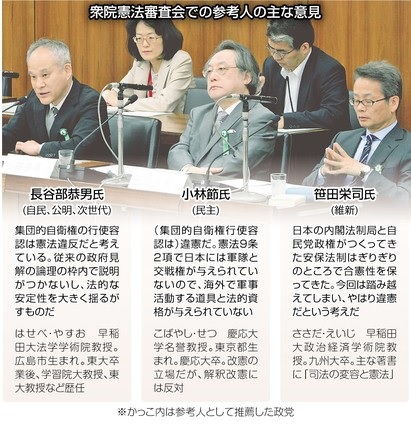 参考人として出席したのは、自民、公明、次世代の各党が推薦した長谷部恭男(はせべやすお)早稲田大教授、民主推薦の小林節(こばやしせつ)慶応大名誉教授、維新推薦の笹田栄司(ささだえいじ)早稲田大教授の三人。