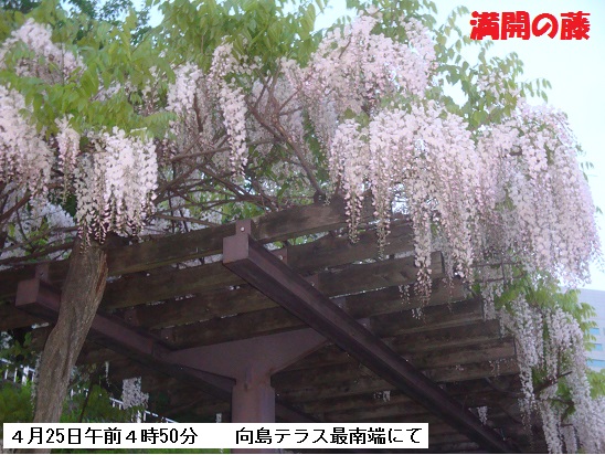 午前4時、家を出て何時ものコースを徘徊します。向島のテラスの最南端の昇降口にある藤棚の藤が今を盛りと咲き誇っていましたが、まだ薄暗く携帯での撮影は無理でしたので、後日に回すことにしました。