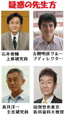 3委員の論文にも疑い 理研調査委「画像切り貼り」など ―― STAP細胞の論文問題で、小保方晴子氏の不正を認定した理化学研究所調査委員会の委員の論文に、画像の切り貼りなど加工の疑いが指摘されていることが一日、分かった。理研は、本格的な調査が必要かどうかを判断するための予備調査を始めた。/調査委では、委員長だった石井俊輔上席研究員の論文に画像の切り貼りが見つかり、石井氏は「不正ではない」としたが委員長を辞任している。/新たに指摘があった調査委員は、理研の古関明彦グループディレクターと真貝洋一主任研究員、東京医科歯科大の田賀哲也教授。/二〇〇三~一一年に発表された論文のうち、古関氏が責任著者を務めた四本や、石井氏と真貝氏の共著の一本、田賀氏が責任著者である二本の計七本に指摘があった。DNAを分離する電気泳動という実験の画像の切り貼りや、細胞の写真の使い回しがあるのではという内容で、理研は田賀氏の論文を除く五本を予備調査の対象とした。古関氏は取材に「指摘の部分は、理研に報告している。現段階で個人的なコメントは差し控えたい」と回答した。 (東京新聞 2014年5月2日 朝刊)