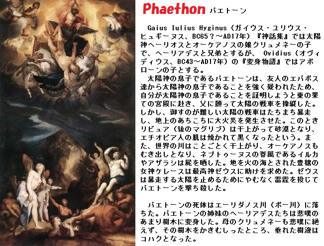 ギリシアでは太陽神はエジプトなどの東洋諸国と違って信仰の対象とされるのは稀でした。Rhodes(ロドス)島だけは例外で世界七不思議といわれる巨大な太陽神像が港口に置かれているように太陽信仰がおこなわれていたようです。太陽神を光明神Apollōn(アポローン)と同一視しようとする試みはBC5世紀以降の文学者達によって行われたと言いますが、一般的とはなりませんでした。此処では古代ローマ、「アウグストゥスの世紀」に生きた詩人Ovidius(オウィディウス、BC43~AD17年)の「Metamorphoses(メタモルポーセース、転身物語)」にあるPhaëthōnパエトーンの物語の概略をあげておきます。