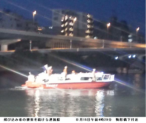お巡りさんから、名前、生年月日、住所、電話番号などを聞かれ、やっと現場から解放された。テラスから遊歩道に上り、山谷堀水門に来ると、山谷堀水門広場には消防車、パトカー、救急車などが何台か止めてあった。女性も交えた数人の係官がテラスに降りる階段に向けて走り去っていた。
