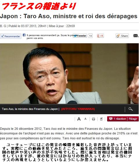 橋下大阪市長の「慰安婦問題」発言、鳩山元首相の「尖閣諸島」をめぐる発言など、政治家の思慮のない発言が批判の的にされてきたが、今度は与党の№2とされる麻生副総理の発言に批判の声が上っている。まあ、こんなことが続けば、海外から日本の政治家の資質が下落したと思われても致し方あるまい。ウェブニュースより