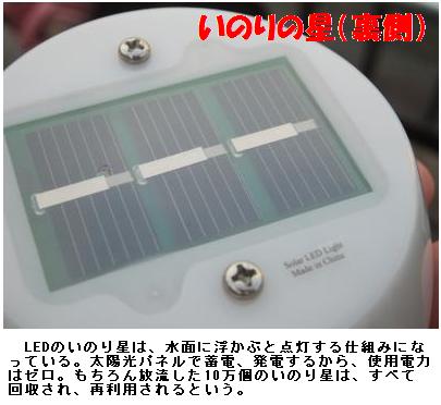 いやはや、この玉は「いのりの星」と名付けられ、パナソニックが提供したLED〔Light(光を)Emission (放射する)Diode(ダイオード)〕発光ダイオード球ということであるが、水面から1つ拾い上げ裏面を見るとmade in China とあった。中央で、上下に別れ中にダイオード電池が十字ビスで納められているものであった。ふと、この玉、記念に1つ戴いて持ち帰ろうかとも思ったが、いやいや来年も使用するとのこと、そっと、元の水面に戻しておいた。